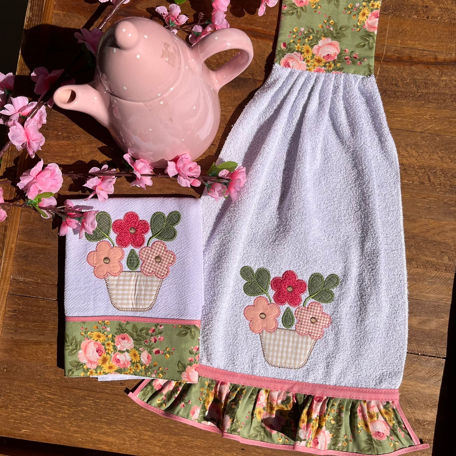 JOGO BATE MÃO E PANO DE PRATO - VASO ROSA.