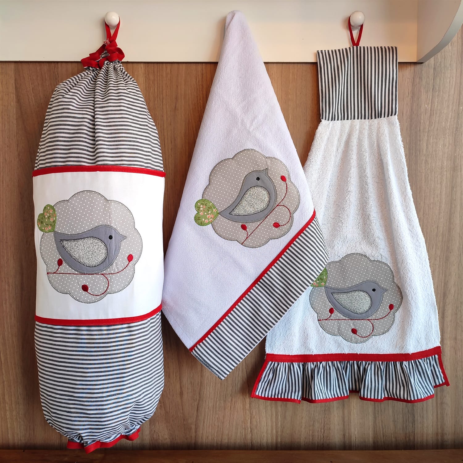 KIT 3 PEÇAS - BATE MÃO, PUXA SACO E PANO DE PRATO - BIRD CINZA