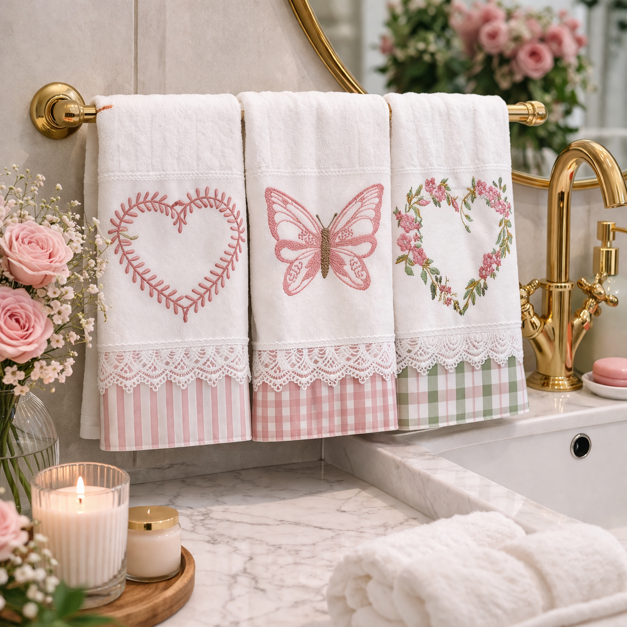 Esse kit com 3 toalhas de lavabo é perfeito para quem ama decoração romântica, elegante e cheia de charme 🌸🦋
