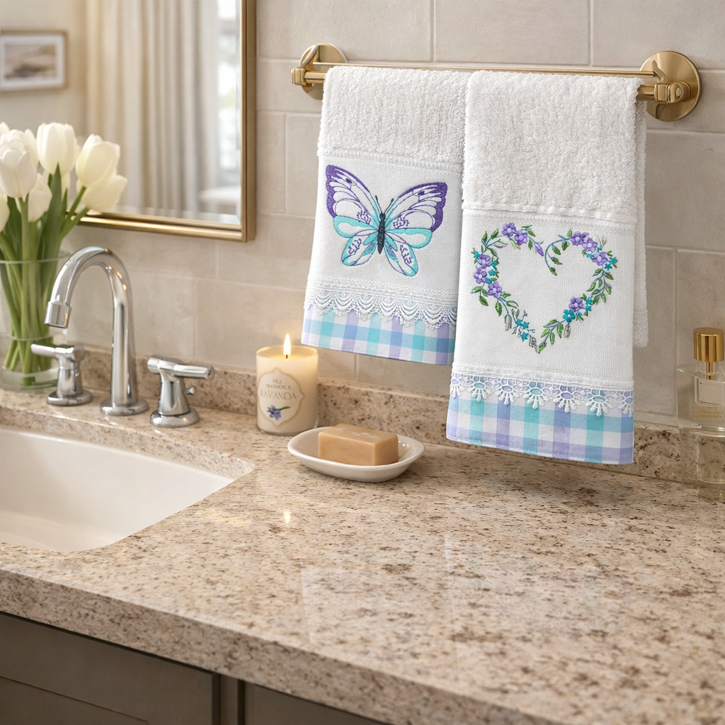 ✨ KIT 2 TOALHAS DE LAVABO BORDADAS – DELICADEZA PARA SEU BANHEIRO